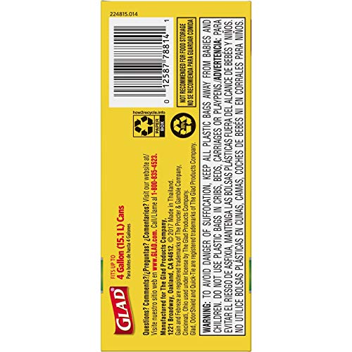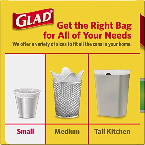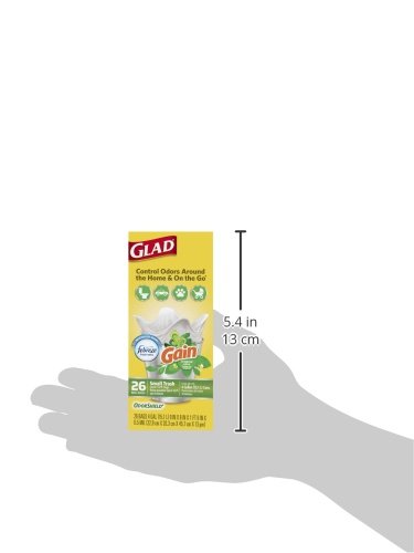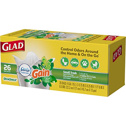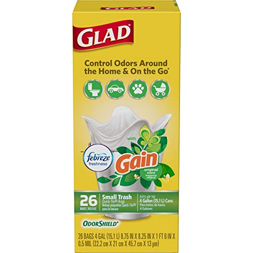Glad OdorShield Quick-Tie Small Trash Bags with Gain Original Scent provide strength plus odor control, to keep your home smelling fresh and clean. These small garbage bags are made with OdorShield technology and Febreze freshness with Gain Original scent to provide continuous odor neutralization around the house, based on time lapse technical evaluation. The Quick-Tie strong and dependable built in flaps provide easy closure with no need for inconvenient twist ties that can be misplaced. The flaps also help keep the bag securely shut to avoid messy trash disasters as you transport it. These 4 gallon size trash bags fit small size trash cans and are great for use in bathrooms, bedrooms, cars, on the go and seasonal cleaning around Spring or Back to School.4 GALLON WHITE PLASTIC TRASH BAGS: Handle daily household and everyday demands with Glad's small sized 4 gallon garbage bag