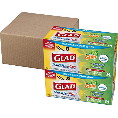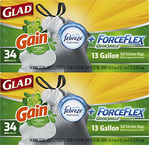 Glad ForceFlexPlus Tall Kitchen Trash Bags are redesigned, incorporating our latest patented 2 layer technology for 13 gallon. The bags have Glad's dependable strength, durability and are ideal for all your kitchen or seasonal cleaning needs. Glad offers LeakGuard, RipGuard, ForceFlex and OdorShield technology that work together to provide complete protection against your toughest kitchen disasters. The 3 ply drawstring securely grips to the trash can, keeping the garbage bag in place until it's full and you're ready to take it out. The outer layer of the white garbage bag is equipped with LeakGuard for added leak protection, while the inner layer stretches to prevents rips and tears with the trusted stretchable strength of Glad's ForceFlex technology. The Gain's Original scent with Febreze Freshness scented trash bags, use OdorShield technology to neutralize the strongest odors for up to 5 days. Glad kitchen trash bags are designed to withstand your tough and messy garbage with RipGuard protection. Just a quick cinch of the durable drawstring makes for simple removal and easy carrying of your trash.13 GALLON WHITE PLASTIC TRASH BAGS: Handle daily kitchen and household demands with Glad's 13 gallon tall kitchen garbage bags in a Gain Original plus Febreze Freshness scent