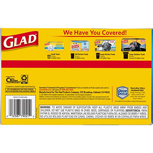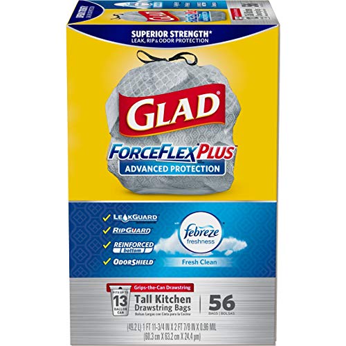 Glad OdorShield trash bags feature innovative reinforcing bands to help add strength whilereducing plastic waste, while the OdorShield technology with Febreze Freshness leaves your home Lightly Scented. The strong, 3-layer drawstring closure makes garbage bags easy to lift, carry and toss away. For easy removal, pull the drawstring to enclose the trash, lift by the drawstrings and toss into garbage. Great for use in any room of the house where you need a strong bag and a fresh light scent.13 GALLON GREY PLASTIC TRASH BAGS: Handle your toughest and messiest garbage and household demands with Glad's 13 gallon Advanced Protection tall kitchen garbage bags with a Febreze Fresh Clean scent
