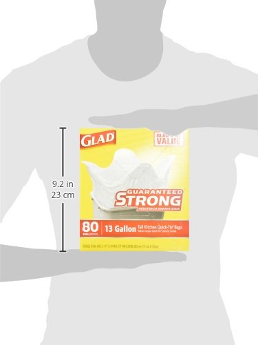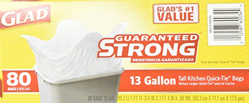 1 ft 11-3/4 in x 2 ft 4 in x .69 mil. Stronger! No Twist Ties Needed: Avoid hassles with misplaced, broken, or hard-to-close ties. Easy to Tie Flaps: Strong and dependable for easy closing. Easy to Lift and Carry: Transport bag with ease. Strong and Sturdy: Avoid messy trash disasters. So Many Uses: Use as a laundry bag; Organize sports equipment and toys; Cover patio furniture; Line your cat litter box; Store holiday decorations; Protect blankets, linens and sweaters. Not recommended for food storage. Made in the U.S.A.13 GALLON WHITE PLASTIC TRASH BAGS: Handle daily kitchen and household demands with Glad's ideally sized 13 gallon garbage bag