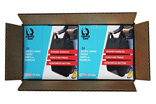 Hippo Sak Large Trash Bags with Handles are perfect for your household outdoor chores. The rugged handles make the bag easier to lift, tie and carry. The puncture proof 1.26 MIL bag can hold full load of leaves, twigs, grass and more without worrying about holes or tears. Our patented PowerStrip reinforced bottom makes our bag 10 times stronger. And the extra length of our bags let's you fill the bag more and use less bags. 48 bags come in 2 boxes of 24.Rugged Handles - Easier to Lift, Tie and Carry