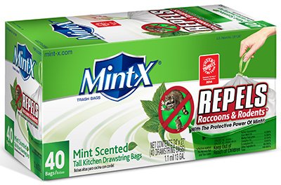 Mint-x, 40 count, 13 gallon, rodent repellent trash bags, 1.1 mil, 24 inch x 27 inch drawstring, infused with a proprietary Mint scent that keeps your kitchen smelling clean when inside, & keeps Raccoons & rodents away when outside. Easily usable product. This product is manufactured in United States.Rodent repellent trash bags