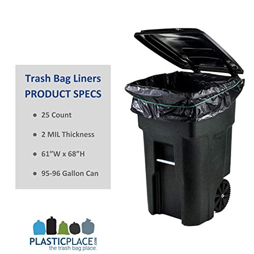 :Another very popular black garbage bag, these affordable 95 gallon capacity bags are a great fit for extra-large rollaway cans. Homeowners love having the option to keep their outdoor trash can clean, and businesses find the extra-large size convenient for dealing with large volumes of garbage. They are also handy to have on hand for big clean-ups after special events. Made here in the USA from superior low-density plastic, these bags are 1.5 mil thick. The bags are sealed with a gusset seam, which has been reinforced multiple times for superior leak resistance.Fits nicely in your Rollaway Container.