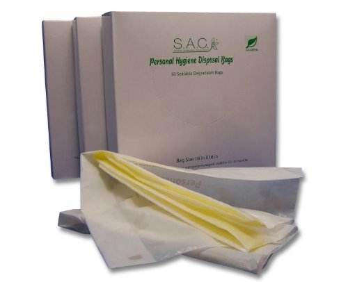 S.A.C. Adult Diaper Disposable Bags for disposable briefs and pads. This Adult Diaper Disposable Bags set contains 3 individual boxes. Each box contains 50 bags. These bags open wide and have a 2 inch gusset allowing for greater capacity. They seal with a draw tape, are opaque and help to contain odor.They can be used directly from the box or using the S.A.C. Adult Personal Hygiene Bag Dispenser model # SD8010. Item number B00435SXIE on Amazon. This bag can also be used as a small Sanitary Waste Bin Liners, 3 -Gallon, Roll for a bathroom or office waste bin.16" x 16" Gusseted bag expands for greater capacity, Seals with a convenient pull string closure